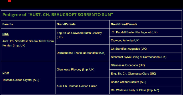 Sire: Aust. Ch. Standfast Dream Ticket from Kerrien (Imp. UK) Dam: Taumac Golden Crystal (A.I.)